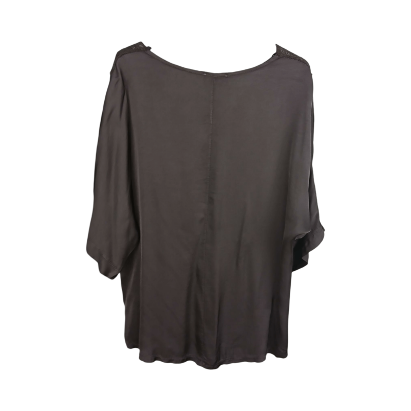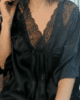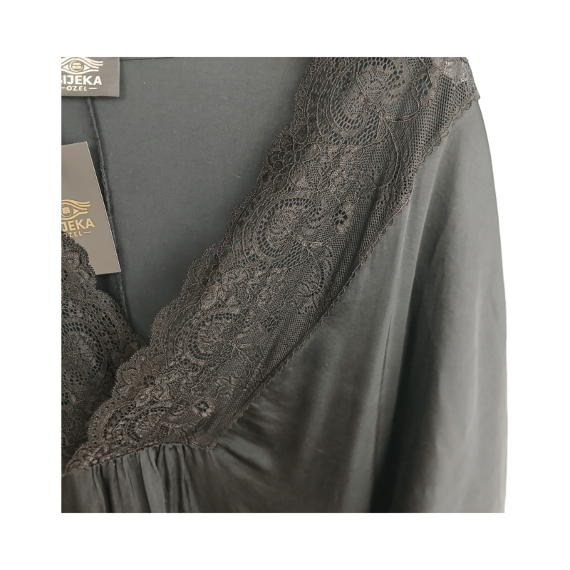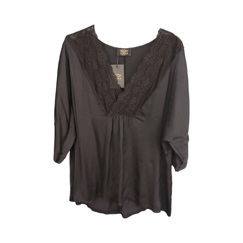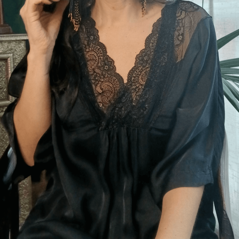 «Esta blusa negra combina perfectamente la sofisticación y la comodidad. Con mangas amplias y un diseño fluido, su escote profundo en forma de V está adornado con detalles de encaje que aportan un toque romántico y refinado. Es perfecta para ocasiones especiales o para darle un toque chic a tu outfit diario.»