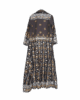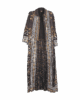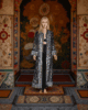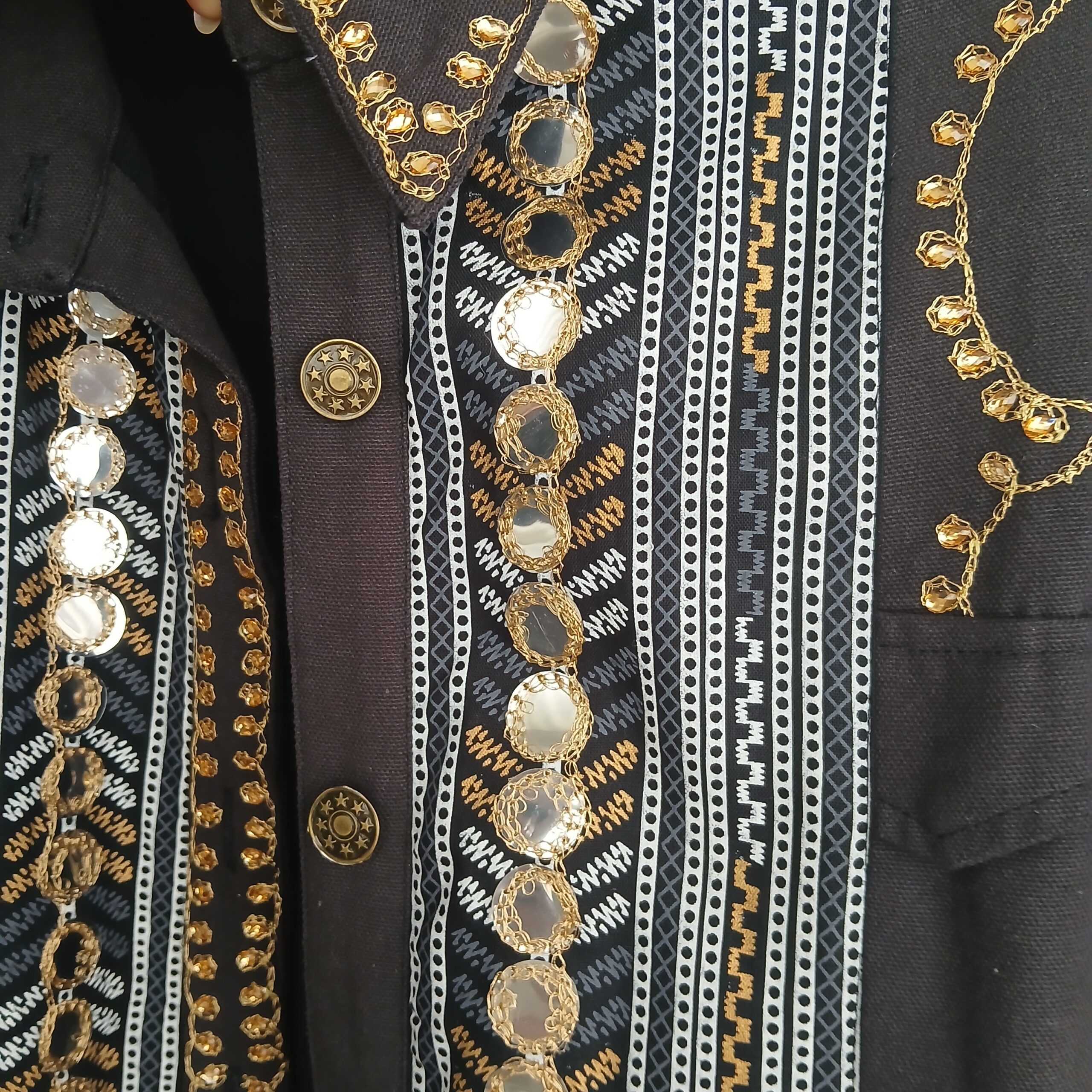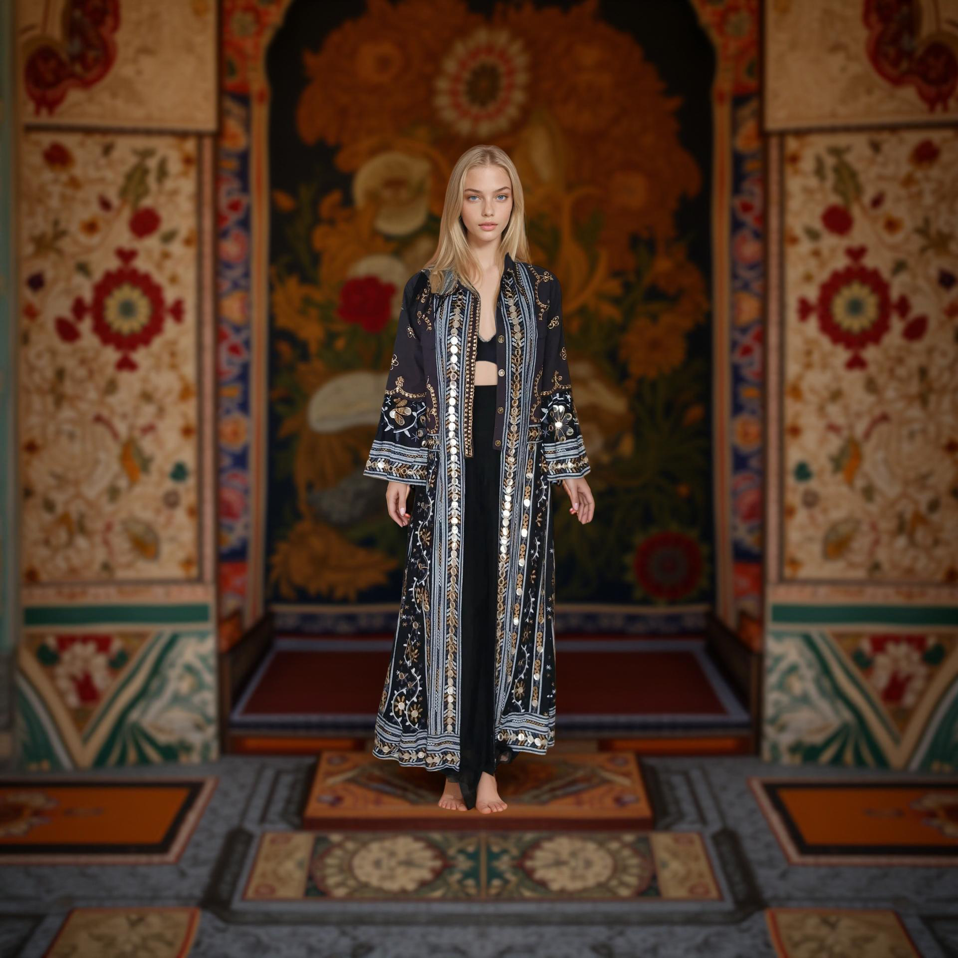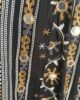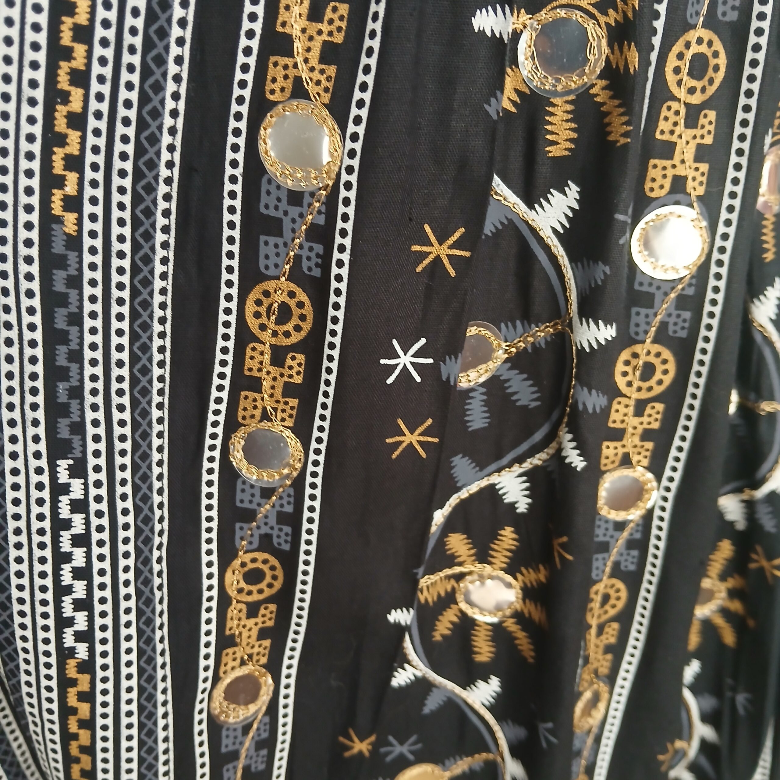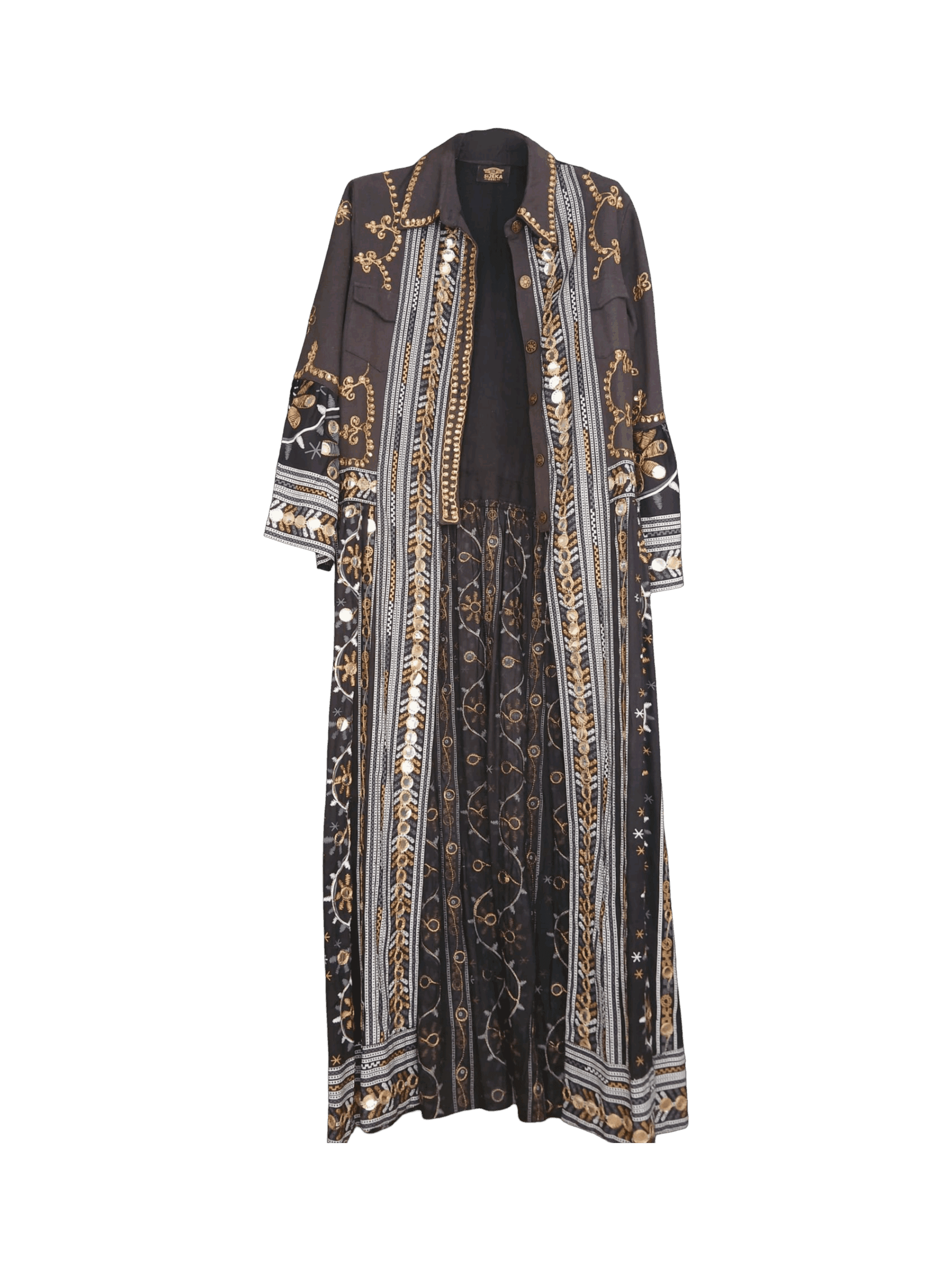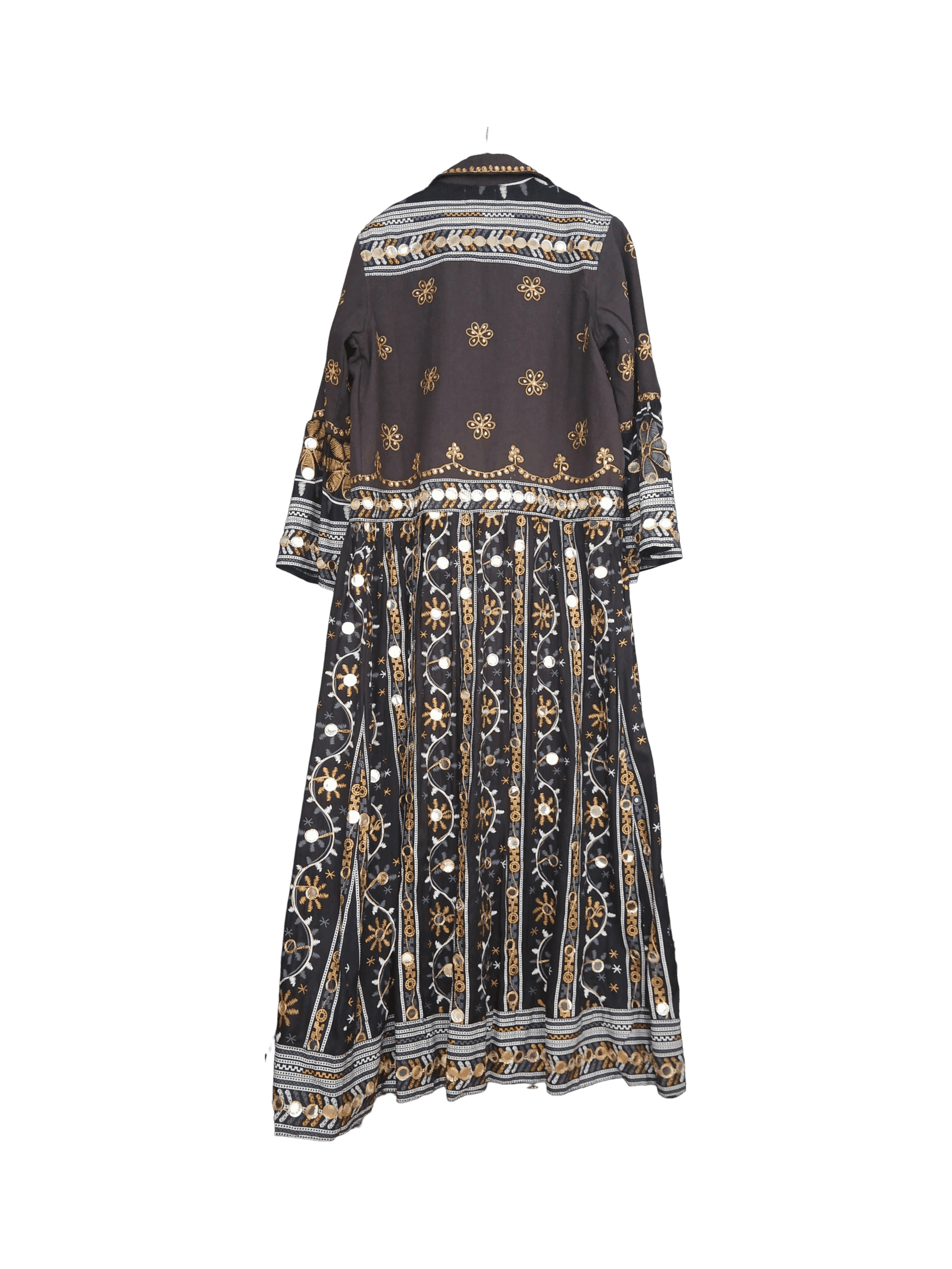 El trabajo artesanal de bordado en hilo dorado y plateado, junto con pequeños espejos cosidos a mano, crea un efecto deslumbrante que captura la luz y el movimiento. Su silueta larga y fluida aporta una presencia única y versátil, ideal tanto para eventos especiales como para darle un giro sofisticado a tu día a día.